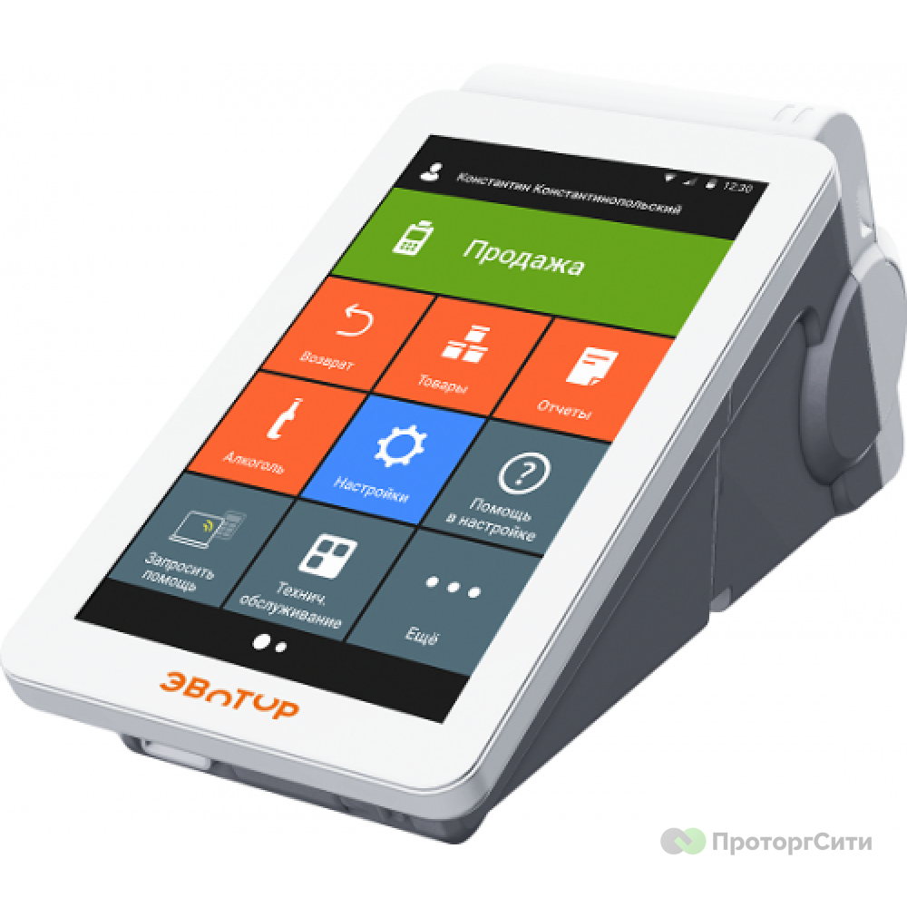 Specifications Manufacturer: Evotor Warranty period: 12 months. Article: ST721-5000 Display size: 7”, capacitive type Camera: No Autocutter: No Ethernet: No Additional interfaces: Cash drawer KKT Evotor 7.2 Smart terminal without FN "Evotor" is a compact online cash register with unlimited possibilities. Everything in one small case: computer, fiscal drive, receipt printer. Evotor can be taught anything you want - just install the necessary application. Evotor online cash registers comply with 54-FZ, are included in the FTS register, work with all registered fiscal data operators. Product flows and categories, cash reports and reference books, online control of the work of points from anywhere in the world, integration with EGAIS and loyalty programs - all this and much more becomes simple and understandable with the use of "Evotor".
